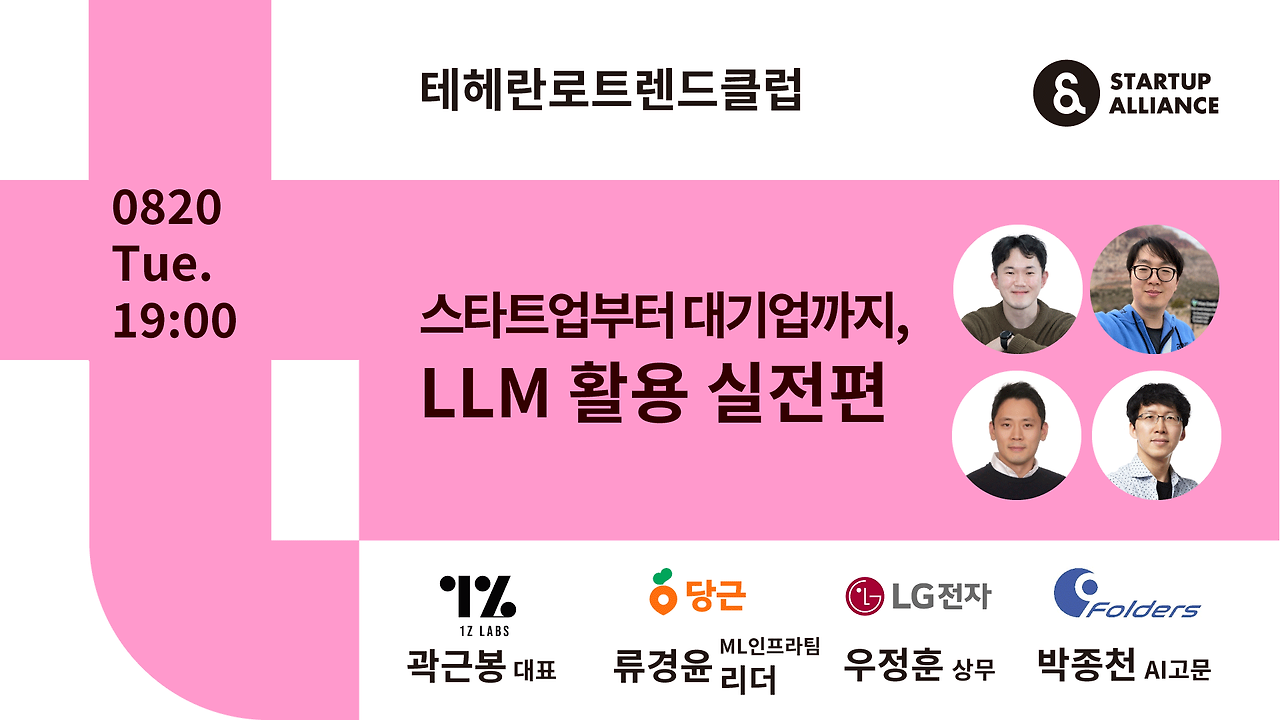 8월 20일, AI 특집 두 번째 트렌드클럽에서는 GPT를 기반으로 타로카드, B2B SaaS까지 다양한 서비스를 운영하는 원지랩스의 곽근봉 대표님, 대규모 중고거래를 효율적으로 관리하기 위해 AI를 도입한 당근 ML인프라팀 유경윤 리더님, 생성형 AI로 빅테이터 접근성, 활용성을 해결해 실제 개발과 업무에 적용하고 있는 LG전자 우정훈 상무님까지, LLM을 실전에 활용하고 있는 다양한 기업 사례를 한 자리에서 들어봤습니다.